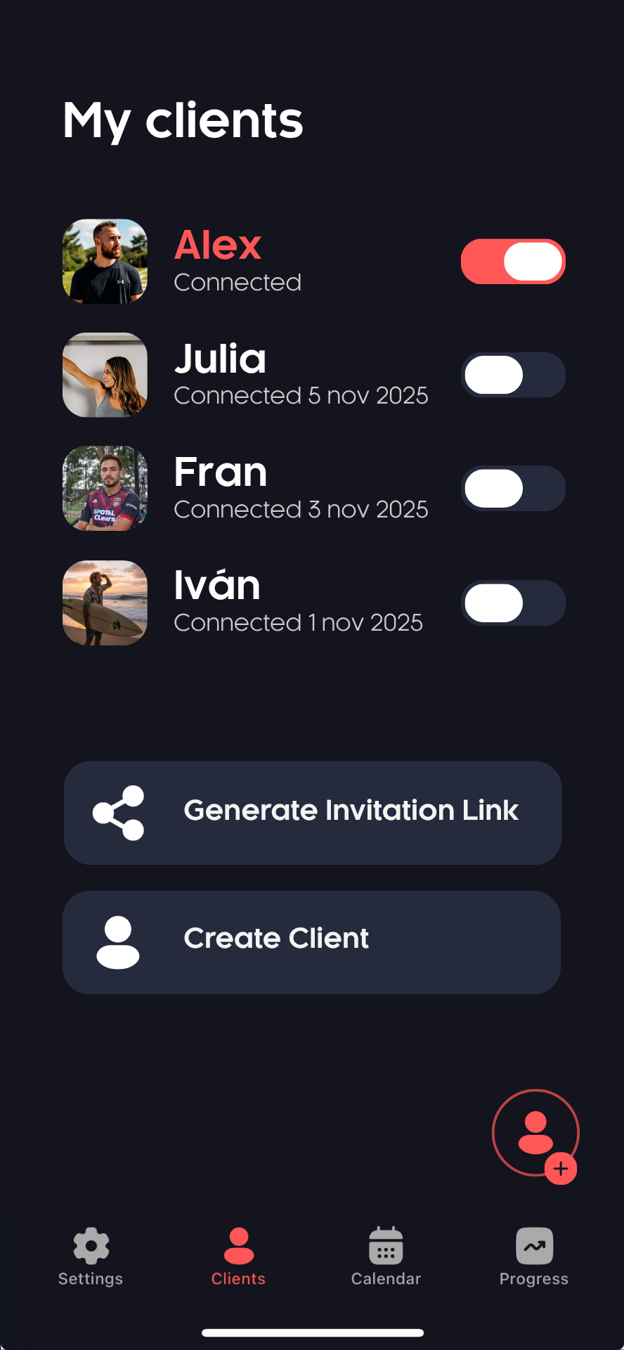 Easily create or invite clients. Manage their training yourself or collaboratively by connecting their app.